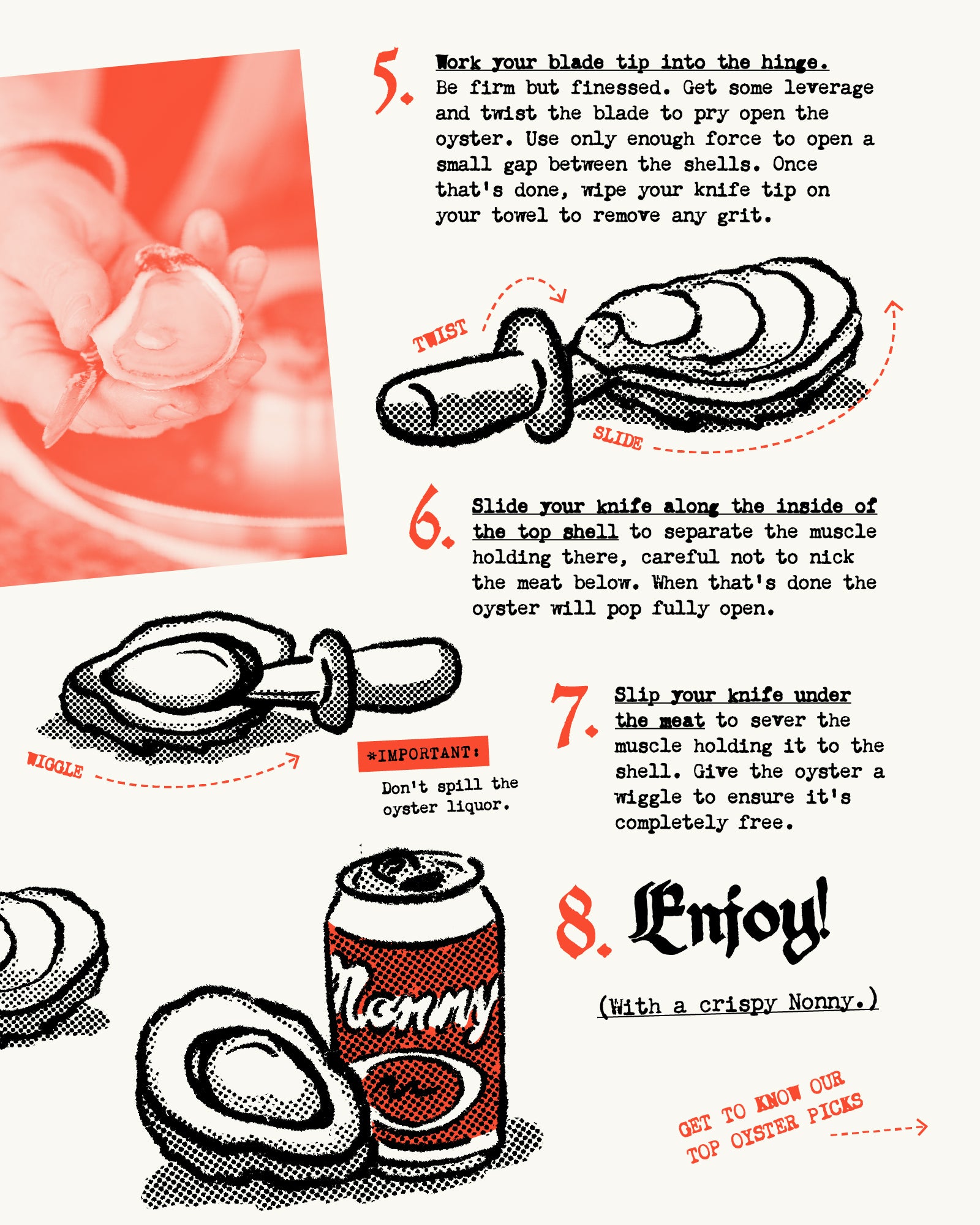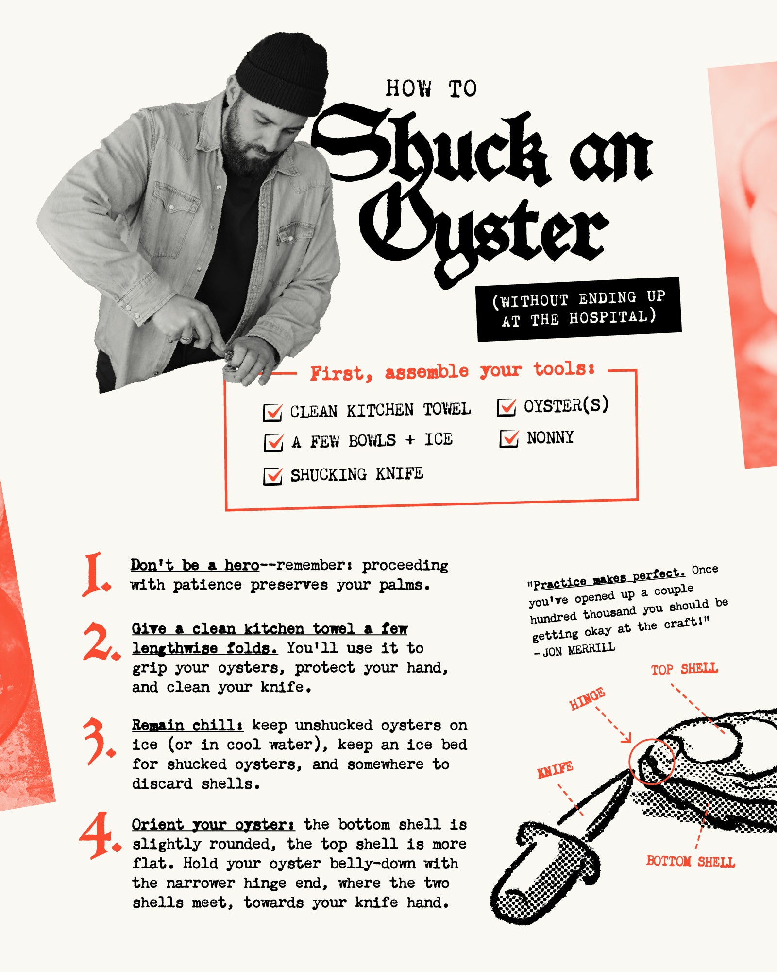 Jon: First and foremost, take your time. It's easy to bury a knife in your hand. We've all done it. You also don't want to be chomping on shell and grit. Speed is great when you've got the experience but enjoying freshly shucked oysters is far better from the comfort of your home than after spending a few hours at the emergency room. The oysters should present like you simply flicked the top shell off. Don't flip the meat. You're simply hiding from your mistakes and any good shucker can spot it. Lastly, don't be a hero. Use a rag to protect yourself from the blade popping through the shell. Other than that, practice makes perfect, so once you've opened up a couple hundred thousand you should be getting okay at the craft!